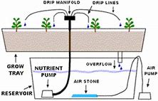 Drip feed systems pump nutrient from a reservoir through small tubes that provide a regular drip irrigation to plants supported in an inert medium. Excess can be recycled and air is pumped into the reservoir to keep the solution aerated. It is important to prevent water pooling at the trough bottom to prevent root rot. Choice of medium should be based on the plant’s drainage preferences.
