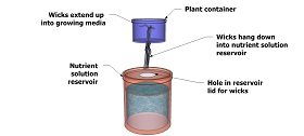 Wicking systems are simple and don’t require power. They are a popular classroom system for this reason. The plant tray is positioned close to and directly above the nutrient reservoir, to minimize nutrient and moisture transport distance. One end of the wick is in the nutrient reservoir, the other in the growing medium. Solution is transported by capillary action. This system is best for smaller, non-fruiting plants with lower moisture and nutrient requirements.
