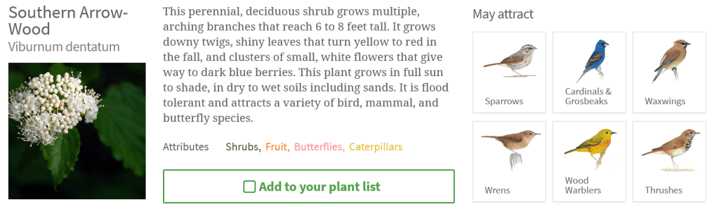 Audubon Native Plants Database By Zip Code, allows you to search for birds that are often attracted to native plants in your local area. You can enter shrubs, trees, perennials, grasses, etc. As an example, a search on shrubs in zip code 22901 produced 34 best shrub results out of a total of 450 total results. The birds attracted to each shrub are also listed. For Southern Arrowwood (Viburnum dentanum), for example, 18 bird species are listed.