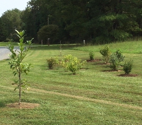 About one year ago, we moved to a property of 7 acres, with much of that acreage still devoted to growing hay. There were only 8 trees when we moved in: 3 weeping willows; a sad Japanese maple; an ornamental plum and a redbud, both removed; a failing weeping cherry in the center of the circular drive; and a crepe myrtle. The “garden” in the center of the drive had cypress shrubs in addition to the weeping cherry and the property is in full sun. The house is built up on a mound of imported topsoil; the south side of the property is low and very wet; the east, west, and north sides are flatter and dryer, with some seasonal wetness. Our landscape is similar to many new construction sites, although the house is about 25 years old. I think many homeowners might face these same challenges to varying degrees.
