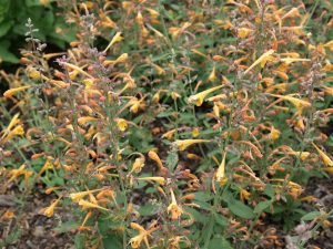‘Apricot Sunrise’ — an erect, shorter plant with tubular, orange-apricot flowers.  It is sometimes identified as Agastache aurantiaca x A. coccinea and by the common name hummingbird mint.  Pat Chadwick has noted that it “has much finer foliage than most of the other hybrids I’ve grown and is tough as nails.”