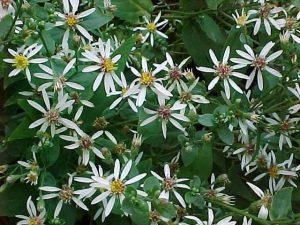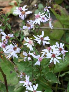 Eurybia divaricata, white wood aster, grows to 3’ tall, prefers partial or full shade, and low-to-medium moisture. Distinctive leaves are heart-shaped, stalked, and coarsely toothed. Small but abundant flowers have white rays (infrequently pink or blue) and yellow-to-red center disks that are borne on dark burgundy, wiry stems. The flowers appear in flat-topped, terminal clusters in late summer to early fall. The plant has no serious insect or disease problems, although it is susceptible to powdery mildew. Aster wilt can also be an occasional problem, particularly if plants are grown in poorly-drained, clay soils. Good air circulation and some morning sun help reduce the incidence of foliar diseases. Propagate by division in spring.