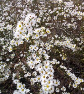 Though most asters need full sun, one standout species in the trial did particularly well in dappled shade. White wood aster (Eurybia divaricata), an aster native to the Piedmont, is described above.
