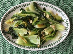 On a recent visit to Druknya House, the newly-opened Tibetan restaurant in Charlottesville, I ordered the bok choy and was not disappointed. Delicious and tasting of butter, I was unable to ascertain how it had actually been prepared. My personal experience with bok choy had been to sauté or steam it quickly, but I had not achieved the amount of flavor that I experienced at Druknya House, so I began to play around with various recipes. My resulting combination of stir-frying and steaming does not include butter, but is packed with low-calorie flavor. By adding leftover tofu with soy-ginger sauce and some brown rice to a helping of this tasty bok choy, I enjoyed a completely satisfying and nutritious meal.