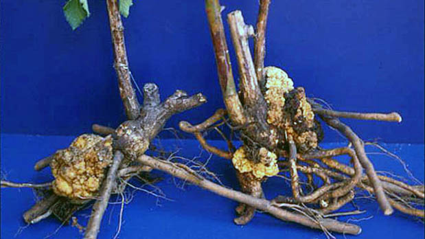 Crown Gall (Agrobacterium tumefaciens): Wartlike growths (galls) appear on the roots or crowns of infected plants. Galls may range in size from that of a pinhead to several inches in diameter. Plants are weakened and yield dry, poorly developed berries. Galls are caused by bacteria present either in the soil or on planting stock. The bacteria enter the plant only through wounds or growth cracks.