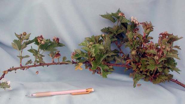Cane Blight – This disease is caused by the fungus, Leptosphaeria coniothyrium, which sporadically attacks canes of all Rubus species. Cane blight usually affects only canes that have been wounded in their vegetative year. All symptoms of cane blight occur in close association with wounds. Infection occurs in late spring or early summer through pruning — especially large pruning cuts — and insect wounds. In the spring, buds fail to break dormancy, lateral shoots wilt, or fruiting canes die when the fruit begins to ripen. Canes are usually brittle at the point of infection, and may break if bent. Symptoms appear late in the season on new shoots where plants have been pruned. Infected areas are brownish purple and develop from the cut ends. Branches originating in the infected areas wilt and die. Fruiting canes show a sudden wilting of branches when the fruit begins to ripen. Weakened canes are more susceptible to winter injury.