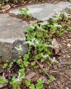 The special value of woodland stonecrop is that it will tolerate part shade, unlike other sedums. Sometimes called three-leaved stonecrop, it will form a low mat of small, rounded succulent leaves in a rock garden or hug path stones along a walkway. In spring, clusters of white star-like flowers rise above the foliage. In winter, the creeping stems root at the nodes and break away from the mother plant. Tolerates deer and rabbits.