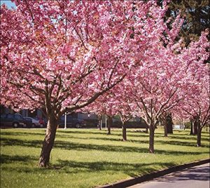 The Kwanzan cherry’s large pink blooms catch the eye in April before green leaves appear; finally, the leaves spread their yellow-red carpet on the lawn in November. Of course the pristine white magnolia flowers of summer delight southerners. Michael Dirr’s book describes the colors and their seasons.