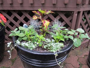 A Thriller, Filler, Spiller for Shade or Partial Sun Pictured at left is a recently-planted flamboyant centerpiece with a colorful coleus ‘Twist and Twirl’ (Plectranthus scutellarioides), contrasted with dahlias (Dahlia pinnata) which will bloom in vibrant shades of yellow, and the thin leaves of two ‘Silver Sand’ cushion bushes (Calocephalus brownii), surrounded by ‘Silver Falls’ dichondra (Dichondra argentea) for a showy display of delicate leaves flowing out of a large container.