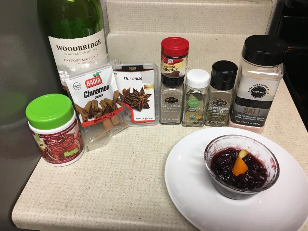 We start by draining into a stock pot one whole liter bottle of red wine, I prefer Cabernet Sauvignon (pardon my French). Add a few spices (just a pinch of each): Bay leaf, Star Anise, Cardamom, Cinnamon, Allspice, and black peppercorns. Bring this to a boil to remove the alcohol, steep the spices, and reduce by half its volume..