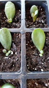 Newly-propagated jade plants from leaf cuttings. Photo: Pat Chadwick Whole Leaf without Petiole. Some plants have leaves that lack a petiole and are attached directly to the plant stem. These plants are capable of forming new roots and buds directly from the leaf. Jade plant (Crassula), Kalanchoe, Sanseverias, Echeveria, and Sedum are examples of such plants. Simply cut or snap off a leaf right at the base where it is attached to the stem. Place the leaf on a tray or other flat, dry surface to allow the cut to dry and callus over. This can take a few hours to several weeks, depending on the species and the thickness of the leaf. Once the callus is formed, place the leaf on top of a loose, well-draining potting medium and angle the leaf so that the cut end is just barely covered with soil. Roots usually begin to form within about 3 weeks.