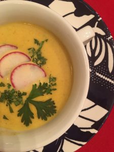 Lately, I have been experimenting with more root vegetables and I have come to love the carrot’s neglected cousin, the parsnip. As a child, I don’t remember parsnips (Pastinaca sativa) ever being served on their own for dinner and I certainly never unwrapped raw parsnip sticks in my lunch box! Parsnips are slightly sweet and are often paired with carrots in recipes. They are delicious roasted with a little garlic, as well as boiled and mashed. The following recipe for parsnip soup is revised from a favorite in The Greens Cook Book. It is easy to make and long on flavor. Choose the smallest parsnips possible, free from feathery threads, as they will be less fibrous and sweeter than the larger ones.