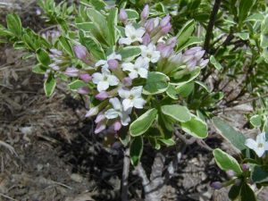 Daphne x burkwoodii ‘Somerset,’ a cross between D. cneorum and D. caucasica, is suited to zones 5-8.  This cultivar is a slow-growing, densely branched, deciduous shrub which typically grows 2’ to 3′ tall and 4’ to 5’ wide with a rounded, mounding habit. It features clusters of extremely fragrant, creamy white to pale blush-pink flowers in late spring which are followed by tiny red drupes in fall. Small, dense, oblong, bright green leaves often persist well into December with no fall color.