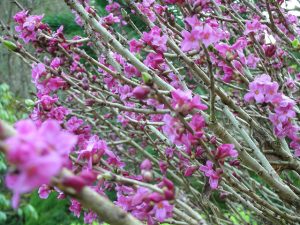 Many of the daphnes are small, rounded shrubs which makes them quite effective as anchor plants in smaller gardens. The beautiful, highly fragrant blooms and variegated evergreen foliage of D.odora justifies its use as an eye-catching accent plant. Daphnes can also be massed in shrub borders as long as they are situated in protective sites. Good drainage is a necessity and so the plants are good candidates for raised beds. The smaller shrubs do well in containers and the prostrate forms are well-suited to rock gardens or used as fillers in foundation plantings. Daphnes should certainly be stationed in a spot where you can enjoy their fragrance. They offer a welcoming presence along an entry path, by the sides of porch, in a corner of a deck or patio, or any other gathering place or high-traffic area. Spend some time evaluating the proper site so that you don’t need to move them once they’re established. And then, breathe in deeply and enjoy!
