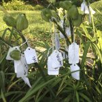 Hybridizers begin their work by creating paper labels or a marking system for their desired crosses. Early in the morning, before the bees have had much time but after pollen has dried, they transfer pollen to end of the pistil (in the center of each flower). The flower on the parent plant is then labeled with the cross. When you visit a hybridizer’s garden, you might see labels hanging all over the plants!