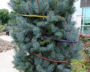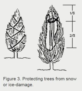 You can protect smaller upright evergreens such as arborvitae and juniper by wrapping or tying together the branches, and circling the plant with a soft cord, twine, or fabric strips, up to about ¾ of the way to the top. Pulling the branches together and securing them in an upright position can reduce the weight of the snow or ice. A slightly different version of this wrapping technique is used on vulnerable shrubs.