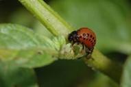 Both the larvae and adult Colorado potato beetle feed on the leaves of potato, eggplant, and to a lesser degree, tomato and pepper plants. Severe infestation will also damage fruit. Active period is May through August.