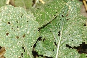 Flea beetle damage to turnip leaves. Photo: University of Minnesota Extension