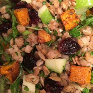 After tasting farro, I decided I must add the grain to my pantry but, upon my return to Charlottesville, I had difficulty finding it. A year or more passed before I stumbled upon a recipe for farro salad in The New York Times Magazine. By then, farro could be found on grocery shelves throughout Charlottesville. Chef Ryan Hardy’s dish quickly became my favorite summer salad. The recipe below is my fall version of the one from Chef Hardy’s restaurant, Charlie Bird’s in SoHo. Cooked in apple cider, I have substituted butternut squash, apples, cranberries, and pumpkin seeds for tomatoes, radishes, and pistachios. Make the bowl your own by adding whatever you like–avocado and beets are both tasty additions.