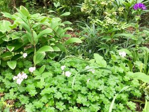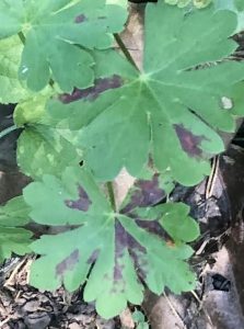 Following Lisa Kohl’s advice — which was endorsed by Elizabeth Bush of the Plant Disease Clinic at VA Tech — I could soon be found snipping and pulling infected leaves from the geraniums, ferns, stinking hellebores and Solomon’s seals in my garden. I maintained a special garbage bag just for these pickings, and I was careful to sanitize tools and my hands afterwards. Within a few weeks, I was already seeing results; the spotted leaves were rapidly replaced with fresh, new, lesion-free leaves. Before I started, almost all my geraniums were spotted. By the end of the summer, almost all of my geranium leaves were free of spots!