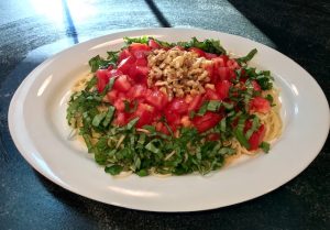 This is a great recipe for enjoying summer’s bounty of tomatoes, basil, and garlic. Essentially it is a deconstructed pesto, using ingredients whole, instead of blending them. Please feel free to adjust amounts of ingredients; I typically just eyeball amounts.