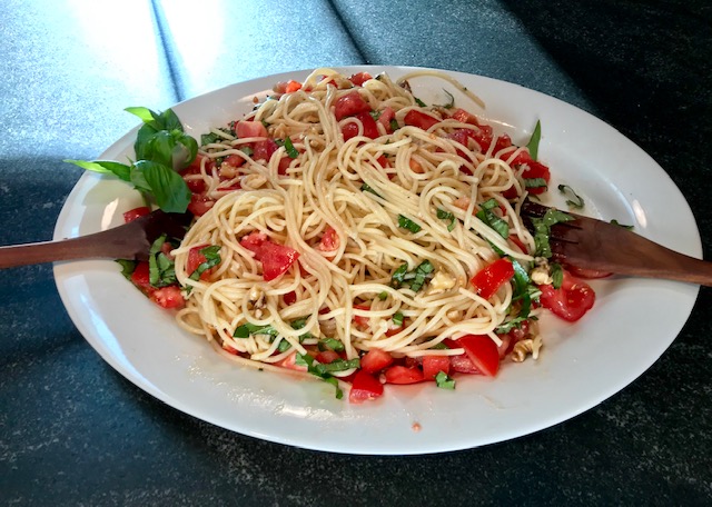 Place cooked spaghetti on a platter or in large shallow bowl. Make a donut ring of the tomatoes in the middle of the spaghetti/pasta. Add walnuts to the donut hole in middle of the tomatoes. Put the chopped basil in a ring around tomatoes.