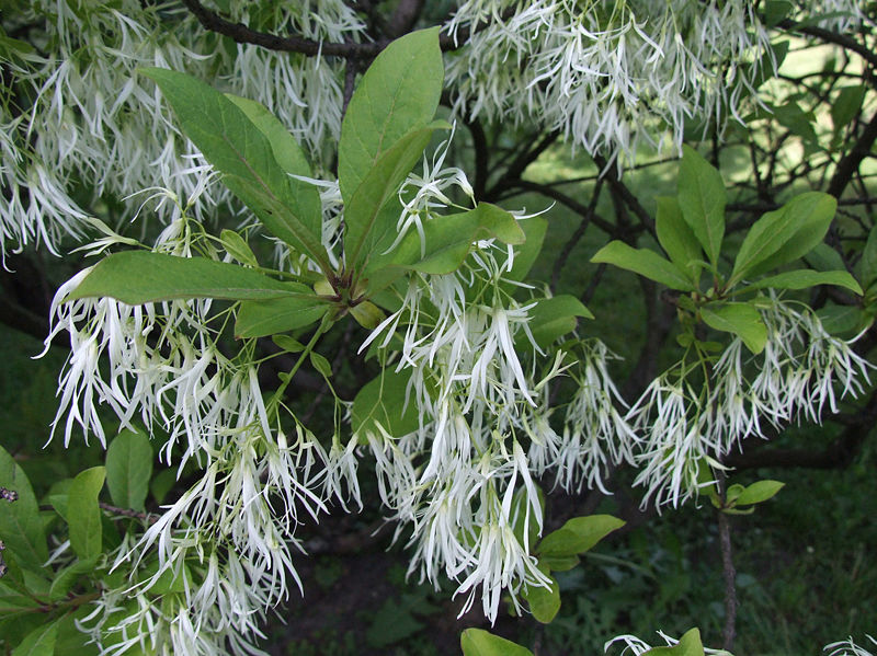 A related species that is native to eastern Asia also grows in this country. Chionanthus retusus, or Chinese fringetree, was Introduced here in 1845.  It looks very similar to our native species but is less hardy (USDA zones 6 to 8).  By comparison, our native species tends to have a more open canopy whereas the Chinese species is denser in appearance.   The Chinese species is a little larger (15 to 25 feet tall) than our native species but the leaves and flower clusters are smaller.    Both species bloom at about the same time in late spring.
