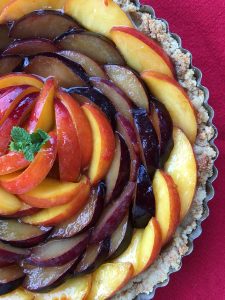 For the tart pictured above, I spread the creme patissiere onto the bottom of the cooled crust, then arranged glazed nectarines, plums, and apricots on top of that. For my glaze, I melted a small amount of  Flamin’ Peach Jam from Chiles Peach Orchard on the stovetop and poured it over the cut fruit.  I love the kick that the red pepper flakes added to the sweetness of the sugary peaches. You may also spread the jam directly onto the crust, beneath the layer of creme patissiere, and leave the fruit unadorned. Using what’s in season, experiment with other fruits and jams to your heart’s content. The possibilities are endless.