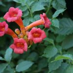 Campsis radicans ‘Minnesota Red’  — a dark red flowering trumpet vine growing to 30 feet