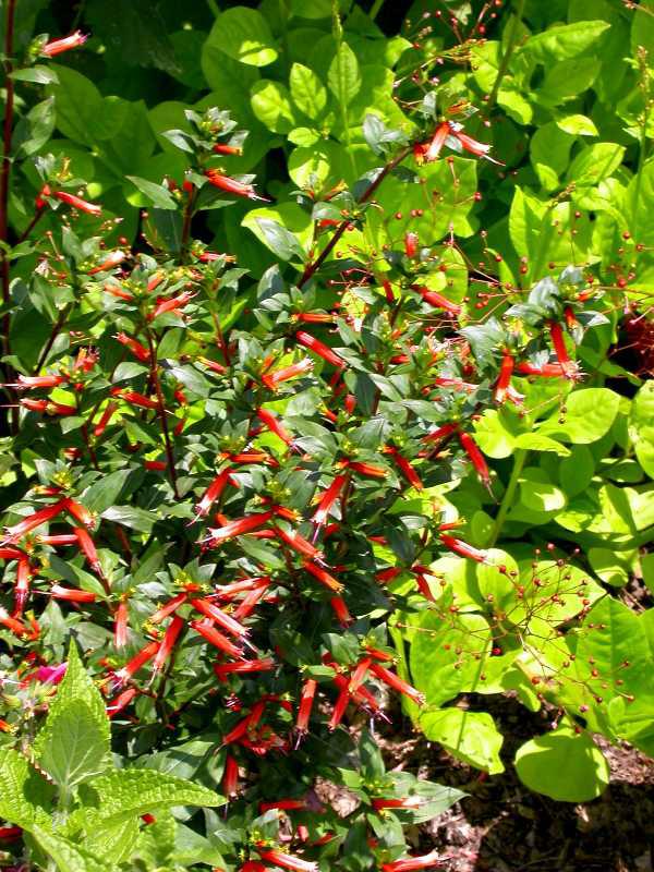 Cuphea ignea, commonly called firecracker plant or cigar flower, is native to Mexico and the West Indies. It is a rounded, many-branched evergreen sub-shrub that grows 20-30” tall and wide.  It has small, tubular, bright red flowers that bloom from late spring to frost. Because it is not perennial in our area, you can grow it as an annual or in a container, bringing it inside for winter.  It performs best in average, medium moisture, well-drained soils in full sun, though it tolerates part shade. It is easily grown from seed started indoors 10-12 weeks before last spring frost date. It tolerates high summer heat and some drought, but performs best with regular moisture.  If it gets leggy, prune it back a bit.  There are many species of Cuphea and a number of varieties and cultivars.