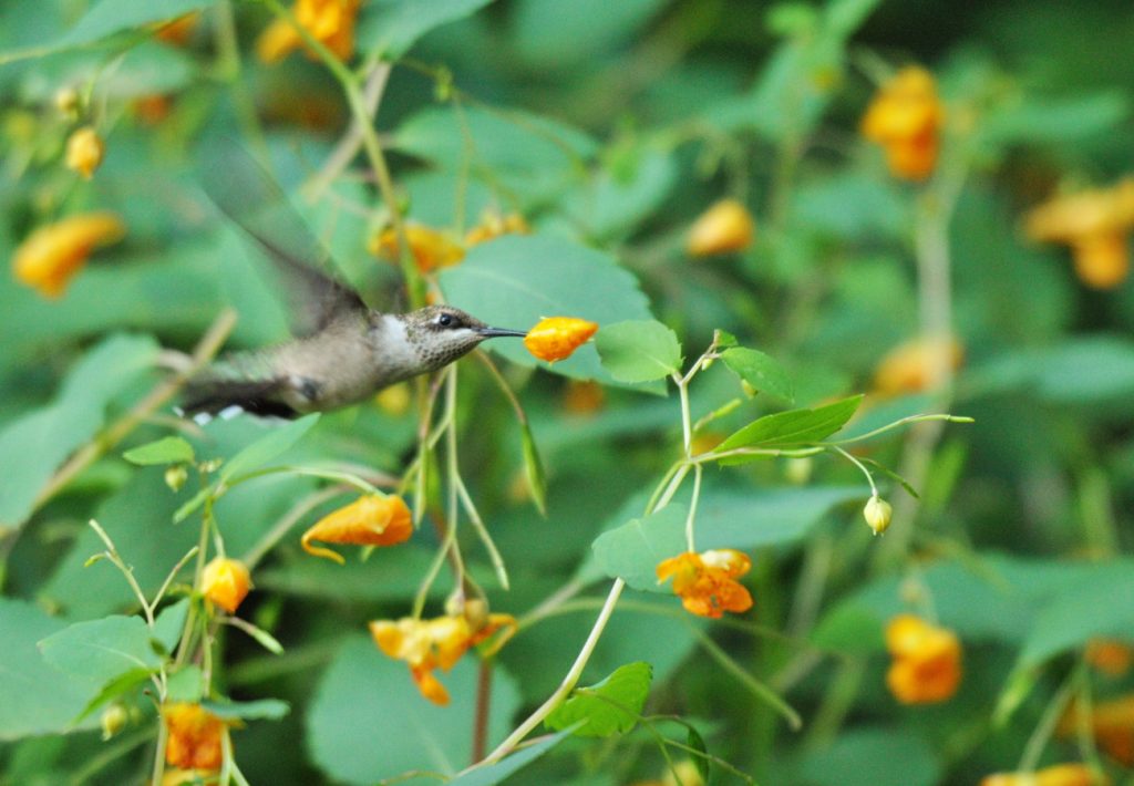 Ruby-throated hummingbird sipping from jewelweed in Brooklyn Botanic Garden. Photo: Steven Severinghaus