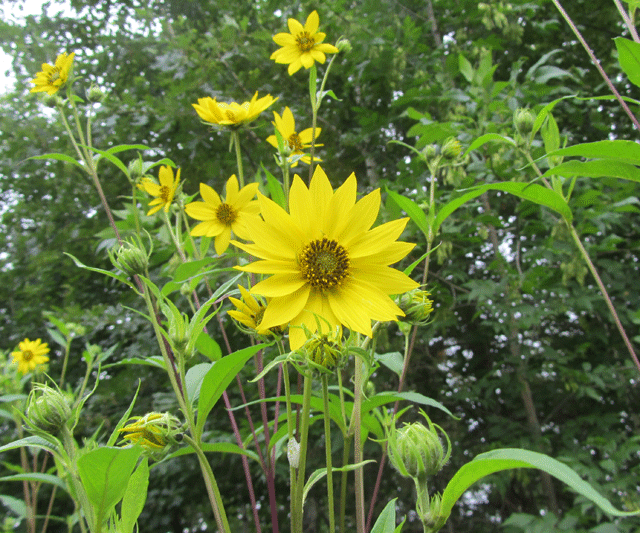 This sunflower has several tall, leafy, branched stems that grow to 3-10’ tall. Leaves vary in length from 10” near the bottom of the stem to 2” near the top. Flowers are 5” across with yellow rays and darker yellow-to-brown centers. Bloom time is August-September. Although it prefers full sun in moist clay-like soil, it can tolerate a wide range of soils. This sunflower is eaten by many livestock but is reportedly NOT attractive to deer. A heavy crop of seeds makes it valuable for wildlife. This is a very big, vigorous grower that can form large colonies. It spreads via vegetative sprouting from a thick rhizome, and from seed. It should not be planted in the middle of flower beds as it eventually overtakes its neighbors.