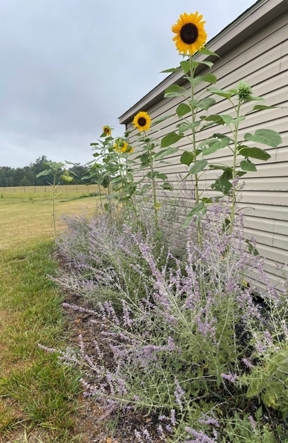 Allelopathy is a biological phenomenon where one plant inhibits the growth of another through the release of allelochemicals. This protective system reduces competition from plants nearby. Research that I found is focused on the effect of sunflowers on agricultural crops. Sunflowers give off toxins from their roots, decomposed leaves, and stem leachates. Field studies have shown that the soil around sunflowers are rich in chemicals, with greatest concentrations under the aerial canopy of the plant, and decreasing with distance away from the plant. In the following season, crops in these fields did poorly not because of lack of nutrients, but because of sunflower residues and remaining chemicals. The efficacy of sunflower toxin is such that the sunflower extracts are being considered as potential organic herbicides. Potatoes are very sensitive to sunflower toxins, but not all plants are affected. Although I found some lists of plants that are considered immune to the toxic effects, I didn’t find supporting studies. The photo of H. Anuus ‘Mammoth Russian’ shows that Russian sage (Salvia yangii, previously known as Perovskia atriplicifolia) is apparently not affected by sunflower toxins. Its height did prevent the sunflowers from getting enough sun in the early growth stage, and so I would not plant sunflowers in this spot next season. I’ll be interested to see if the Russian sage, a perennial, shows negative effects next year.