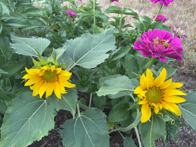 Dwarf sunflowers with zinnia. Sunflowers eaten by deer two days after this photo. Photo: Susan Martin