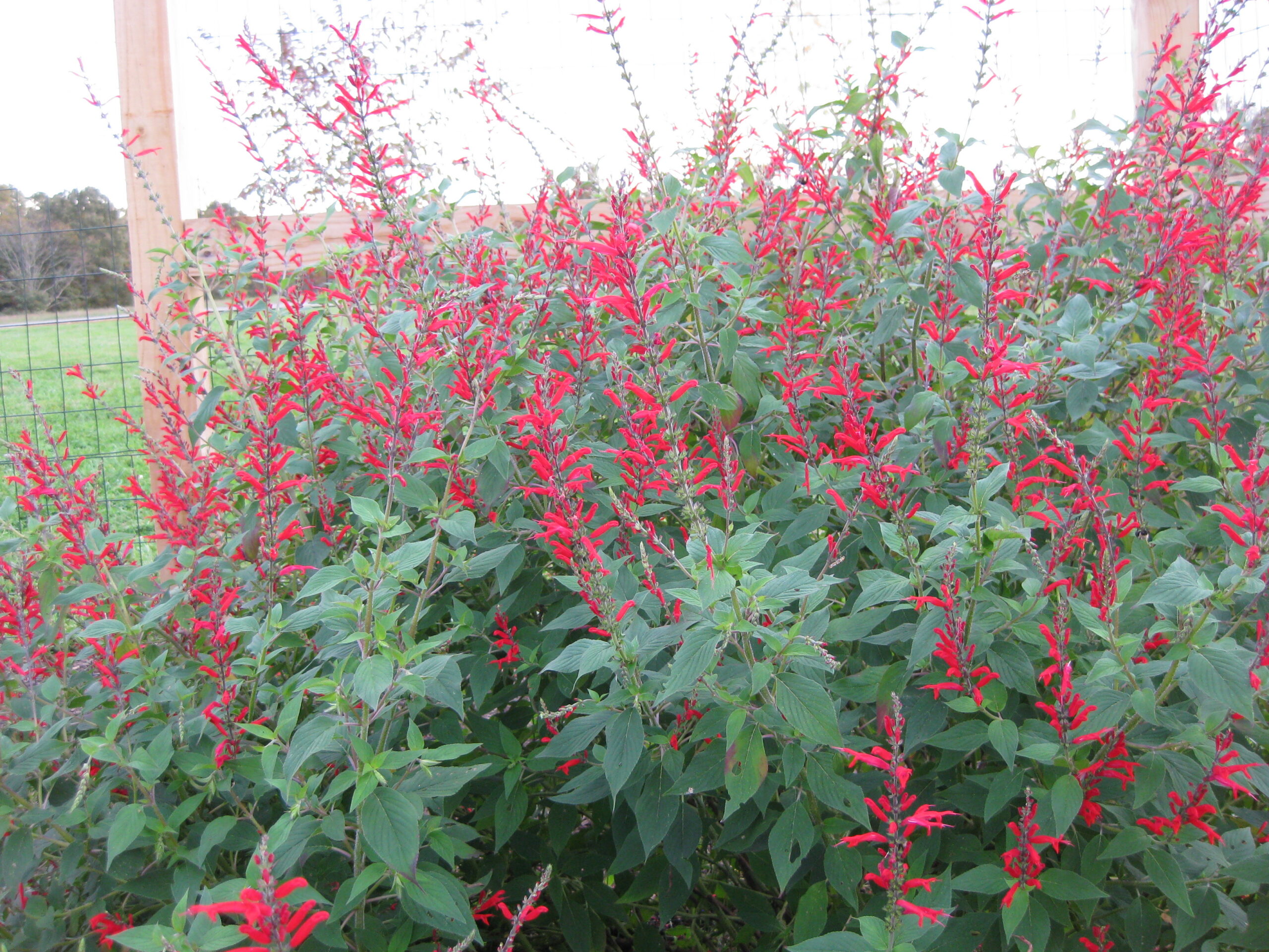 Salvia greggii (Autumn Sage) – This species is native to western Texas and northern Mexico.  Tough, hardy, drought tolerant, and a hummingbird magnet, it has found its way into mainstream ornamental gardens throughout the U.S.  It typically grows 2 to 3 feet tall and slightly wider and is hardy in USDA Zone 7.  Flower colors include red, pink, rose, purple, orange, and white.   Prune it hard in early spring to prevent it from becoming woody and to encourage bushiness.  A few of the many cultivars (usually between S. greggii and S. microphylla) available include: