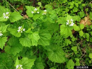 Garlic mustard is popping up in my garden beds and nearby woods. — and probably yours, too! It’s quite easy to pull up, so pull it now before it develops flowers and seeds, as in the photo at right.