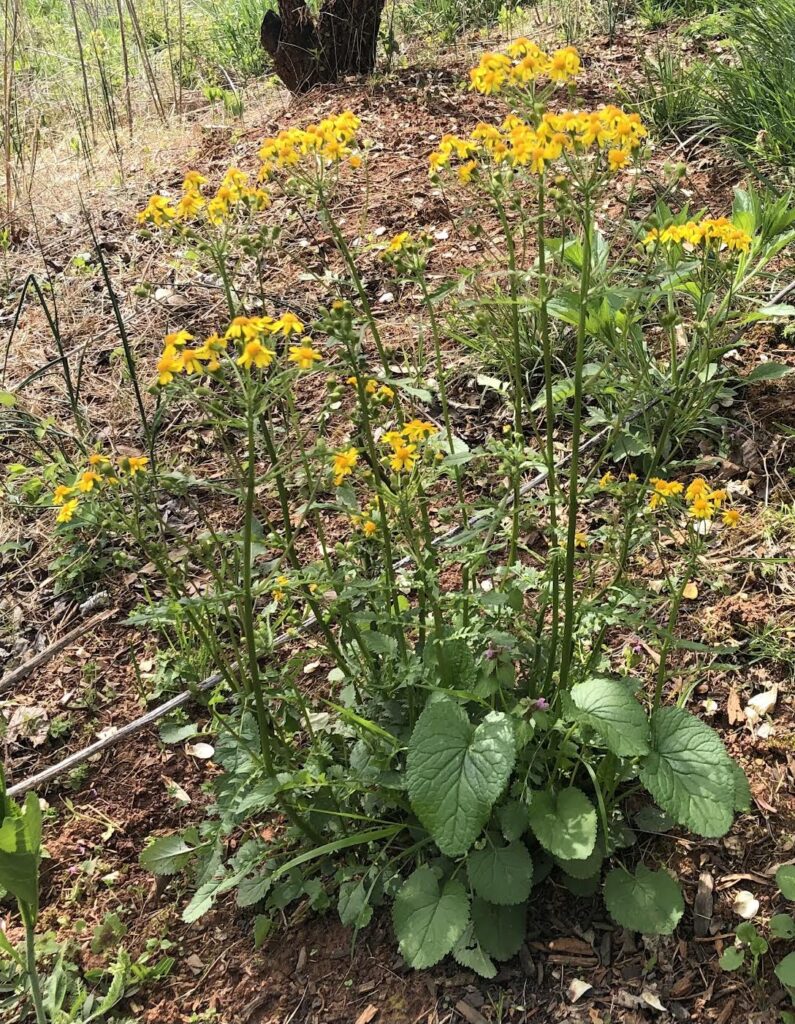 Several plants resemble garlic mustard — if you’ve got only the leaves to go by and no blooms. Two potential cases of mistaken identity are violets and our native Packera — either Packera obovata or Packera aurea. If you’re lucky enough to have a Packera that’s planted itself in your garden — and I’ve been so blessed twice now! — you won’t want to accidentally pull it before it sends up its beautiful yellow flowers! (see photo below).