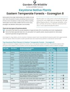 • The National Wildlife Federation’s 2-page list for our Eastern Temperate Forests  also lists the trees, shrubs and flowers that benefit the food web, and also provides information about the plants that support the specialist bees.
