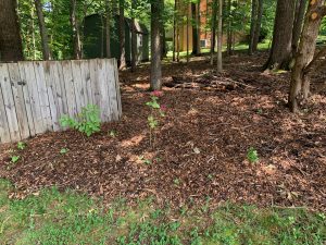 The photo above shows a bed (from a neighbor’s lot, not mine) that was covered with landscape fabric and then mulched with 2 inches of finely ground hardwood mulch a little less than two years ago. The mulch has decomposed and eroded, exposing the fabric, showing how the surface weed seeds germinated in the remaining mulch and that the roots grew through the fabric into the soil below. The bottom line is that landscape fabric is at best a short term weed deterrent that is cursed with many longer-term issues that make its use in garden beds ill-advised.