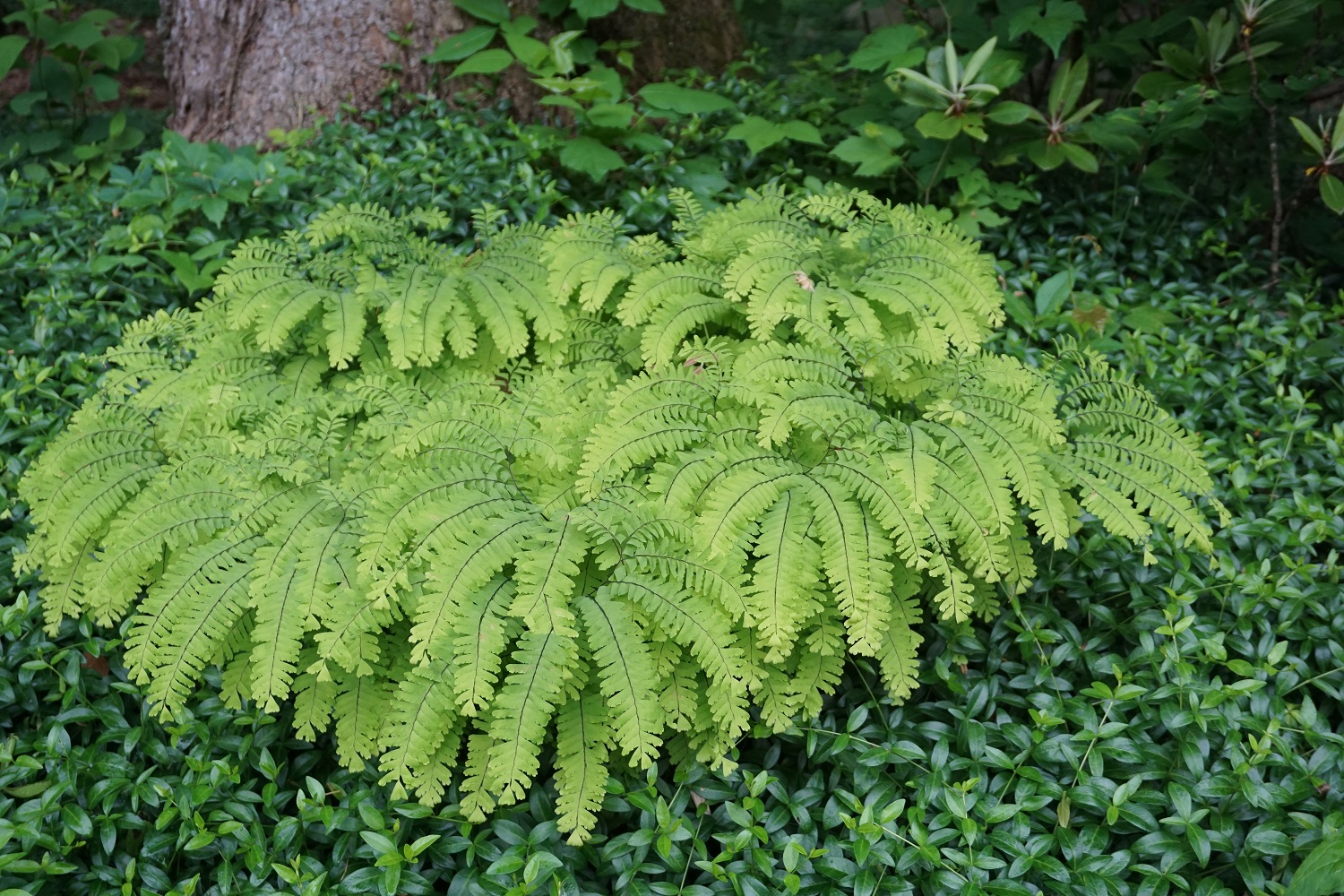 Maidenhair Fern (Adiantum pedatum) is one of the most elegant and graceful of our native species.  A clumping species, it typically spreads slowly by creeping rhizomes in well-drained organic soil.  Its bright green, 12” to 20” long, bright green, fingered fronds cascade in layers on shiny, black stems.  While maidenhair fern thrives in bright light, it cannot tolerate direct sun. Once the fronds wilt from heat or drought, they cannot recover and the plant must produce new fronds.  Don’t confuse this species with Adiantum tenerum or A. capillus-veneris, both of which are grown as houseplants.