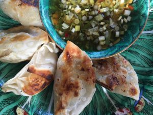 The following recipe is one I created after trying out several different recipes for sauces and dressings, each a variation on the same theme. This one uses less sugar and more vinegar than some because I like the sour taste of vinegar, but you may choose to reduce the acidity of the recipe by adding more sugar to taste. I used this as both a marinade for shrimp over Thai noodles and as a dipping sauce for dumplings. I think it would be equally tasty in a rice salad or over poached fish.