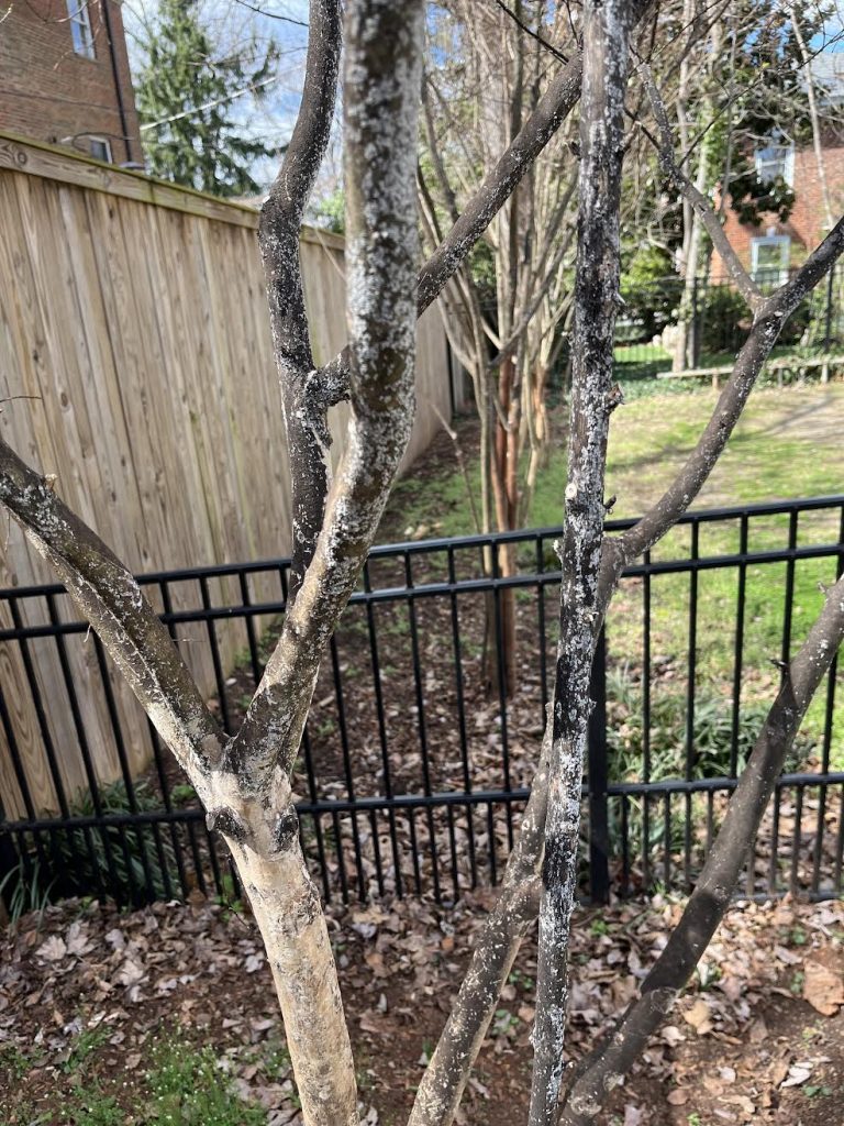 In my case, frost damage to one backyard Crape Myrtle in the early spring of 2023 made the tree especially susceptible to CMBS infestation. From there, the disease spread quickly to six other nearby Crape Myrtles in a backyard stand. Soon all were showing signs of cotton-like lumps and various amounts of sooty mold growth. Fortunately, none of the other trees were nearly as adversely affected as the first, making mitigation slightly easier for them.
