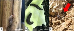 Slugs on vegetation (A, B) and slug eggs under plant roots (C). Photo: U of MD Extension