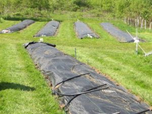 If you are a minimum-till gardener who is struggling with weeds and refuses to turn to herbicides for weed control, you might want to try occultation, or covering your beds with a black tarp or plastic for a few weeks. The black cover adds some heat to the very top layer of soil and denies light to weeds that want to germinate, killing them. Many organic farmers are using this technique with good success to kill annual weeds and maintain a low weed count through the growing season. Check out this blog post from the Cornell College of Agriculture titled Take Me Out to a Tarped Field for more details.