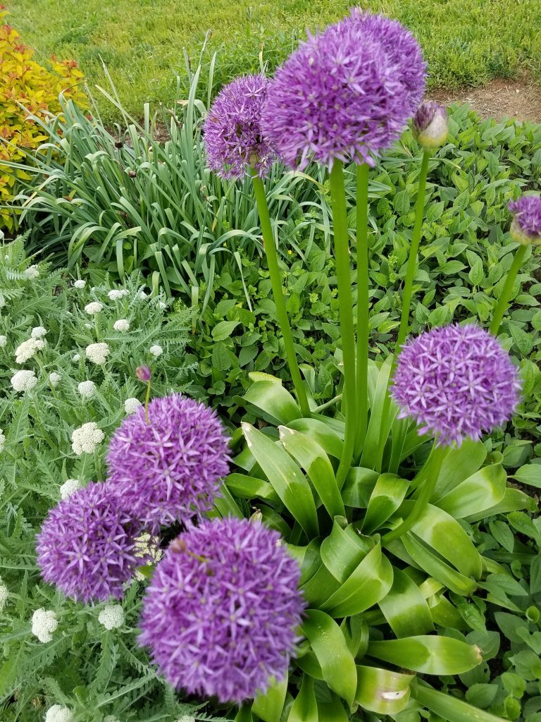 Growing Tips:   “Ornamental onions are drought-resistant plants that prefer soil on the dry side, particularly during the summer months when the bulbs are dormant.  Plant in fall at a depth of about 2 to 3 times the diameter of the bulb.  The strap-like foliage emerges in March and dies back later in spring.  Unfortunately, the dying foliage can be unsightly, so it’s wise to position the bulbs among other plants that will hide the foliage.  For best effect, plant the bulbs in groups.