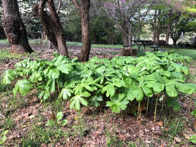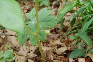 Since deer and rodents do not bother Mayapples, I should have guessed this: All parts of the Mayapple are POISONOUS –– though the fruits are supposedly not toxic when they are fully ripe. A leading horticulturist, A.S. Weakley, says: “The ripe fruits are edible; the rest of the plant contains a variety of alkaloids, and is poisonous-medicinal. Compounds from Podophyllum are used in wart removal, and show anti-viral and anti-cancer promise.” (Weakley 2015). But please DO NOT eat those apples! Scientists may be able to determine when a Mayapple fruit is fully ripe — and thus not poisonous — but don’t try this yourself.