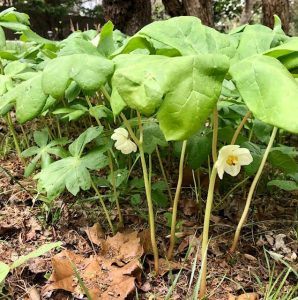 It was many years before I learned that there were Mayapples on my property; they were hiding in an area of mostly invasives, and it was only when we set about clearing those invasives that we discovered the Mayapples. Actually, the discoverer was the knowledgeable fellow helping us with the clearing; he was familiar with them and we sensed his excitement about this find. Nowadays I eagerly look forward to the stems as they push up through the earth in early spring. They’re worthy of daily inspection so you can catch the enchanting sight of unfurling leaves. But these plants are very toxic, so gardeners with young children may wisely avoid planting them.