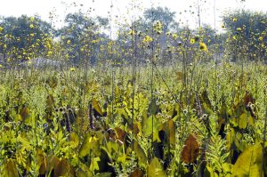 The silphiums are natives of North America. According to the USDA Plants Database, there are 19 species in the genus silphium. The four species we’ll focus on here — the more common ones — are rosinweed, compass plant, prairie dock, and cup plant. Keep in mind that all four are sometimes lumped together under the term rosinweeds due to the sticky resin they exude when stems are bruised. All of these silphiums have sunflower-like blossoms atop tall stems. They seem to be immune to most pests and diseases and are adaptable to most situations so long as they get plenty of sun. Given these characteristics, it’s not surprising that they are capable of taking over a garden. My silphiums have generally been avoided by deer, but now and then I see evidence of browsing.