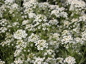 Sweet alyssum (Lobularia maritima) should be at the top of your list, as it is long-blooming, easy to grow, and a favorite of beneficial insects. This low-growing hardy annual will bloom all season, from spring until frost. It is easily grown from seed and can be direct seeded in the garden in early spring. It is also a lovely ornamental for the front of the border or for planters and is delightfully fragrant with a scent reminiscent of honey. They will grow in full sun or part shade.