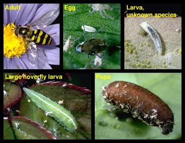 You will want hoverflies to visit your flowers for pollen and nectar, because they will lay their eggs near aphids and other soft-bodied insects, and their larvae will eat up to 60 aphids per day. The adults resemble little bees, but they do not sting. They lay eggs (white, oval, laid singly or in groups on leaves) which hatch into green, yellow, brown, orange, or white half-inch maggots that look like caterpillars. They raise up on their hind legs to catch and feed on aphids, mealybugs and others.